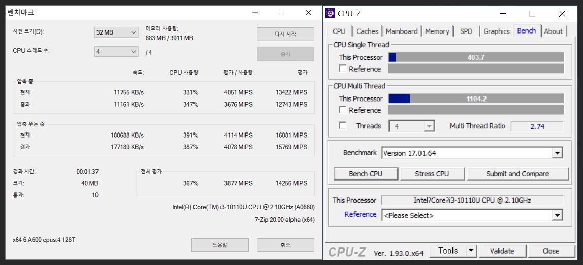 7-Zip 벤치마크와 CPU-Z 벤치마크 결과는 위와 같습니다. 확실히 한 단계 아래 라인업인 펜티엄 골드 시리즈보다 더 높은 퍼포먼스를 기대할 수 있습니다.