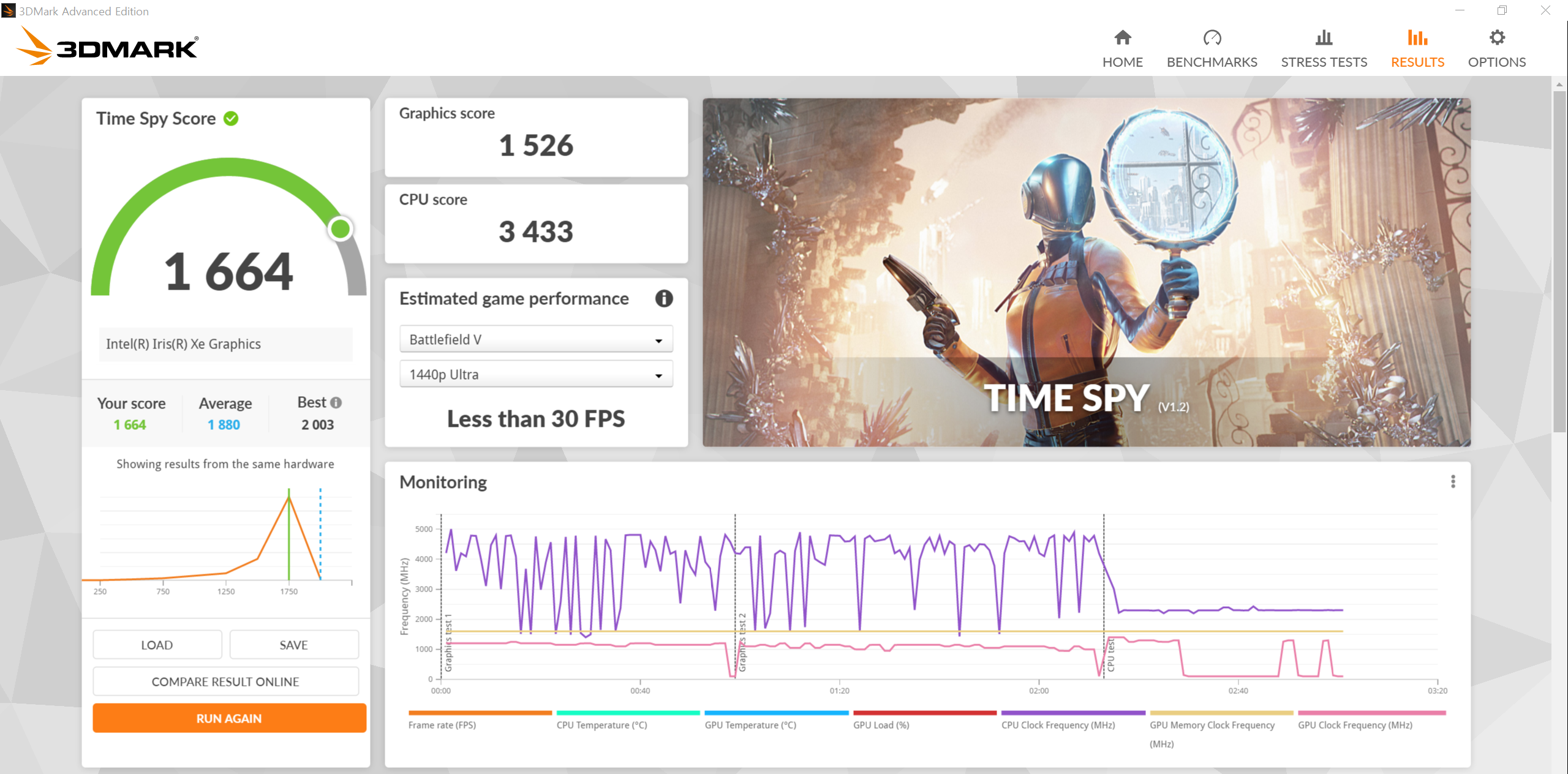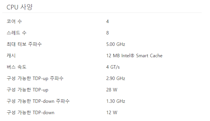4코어 8스레드 구성으로 기본 2.9GHz 클럭에서 터보 부스트를 통해 최대 5.0GHz 속도로 동작합니다. 모바일 프로세서답게 전성비도 나쁘지 않은 편입니다. 인텔 측 주장으로는 기존 타이거레이크 i7보다 더 적은 전력으로 약 10% 향상된 성능을 기대할 수 있다고 하지만, 직접 벤치프로그램들을 돌려본 결과, 평균 3~4% 정도로 사실상 실사용 환경에서의 체감 성능 차이는 없다고 봐도 무방합니다.