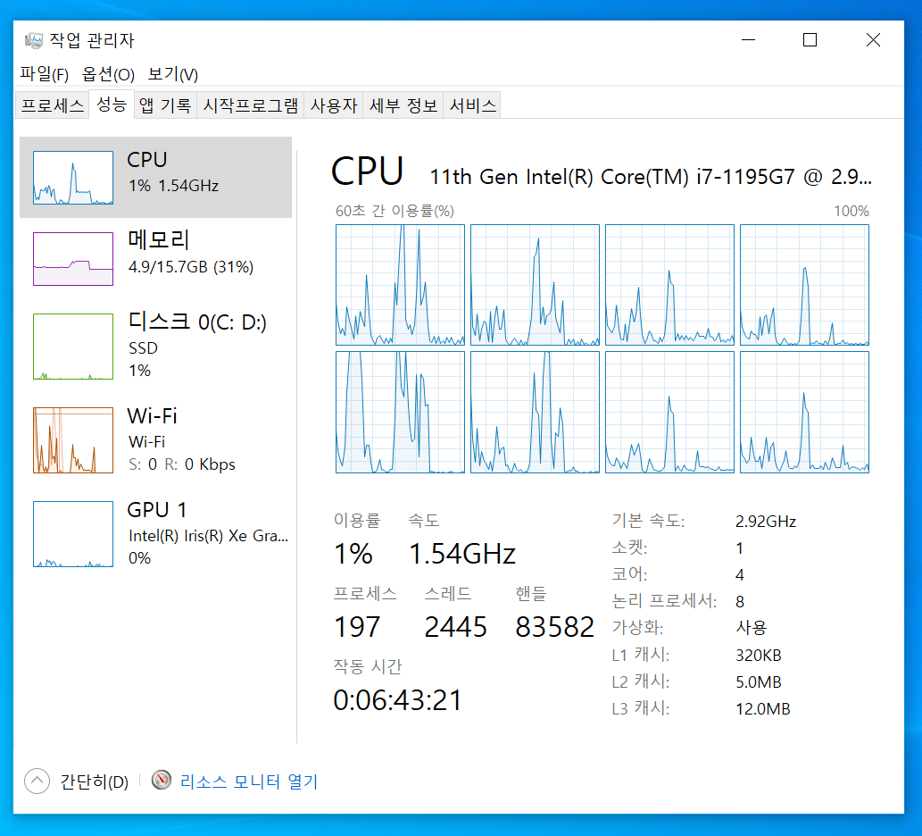 정리하면 인텔 11세대 i7-1195G7과 lg그램은 약간 아쉬운 조합입니다.